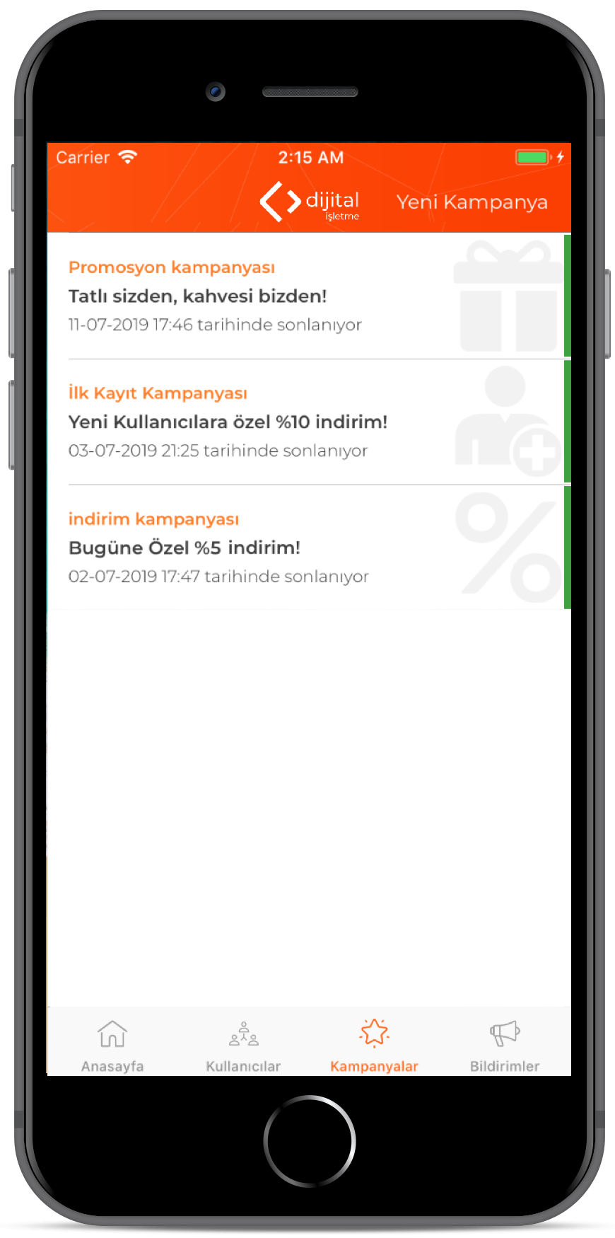Kullanıcılarınıza özel kampanyalar sağlayabilirsiniz. Hesap indirim kapanyaları, uygulamanızı ilk indiren kullanıcılarınıza özel kampanya ya da promosyon kampanyaları tanımlayabilirsiniz.